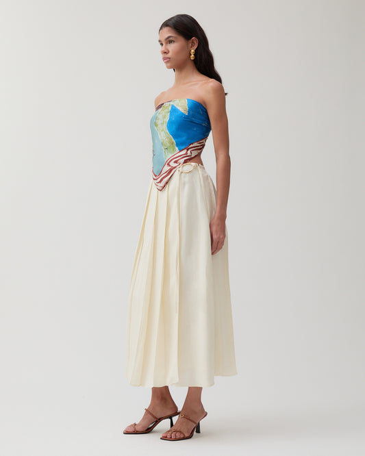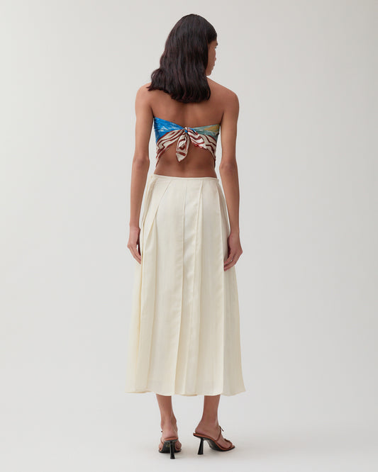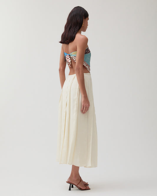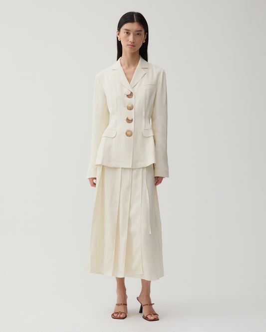 The Alice Skirt in Viscose Off-White is a flowy pleated midi skirt with a brass tie buckle detail. Pair with Etta Jacket in Viscose Off-White for a full suited look.