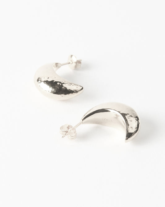 Sculptural crescent-shaped hoops with a polished silver-plated finish. Striking yet versatile.
