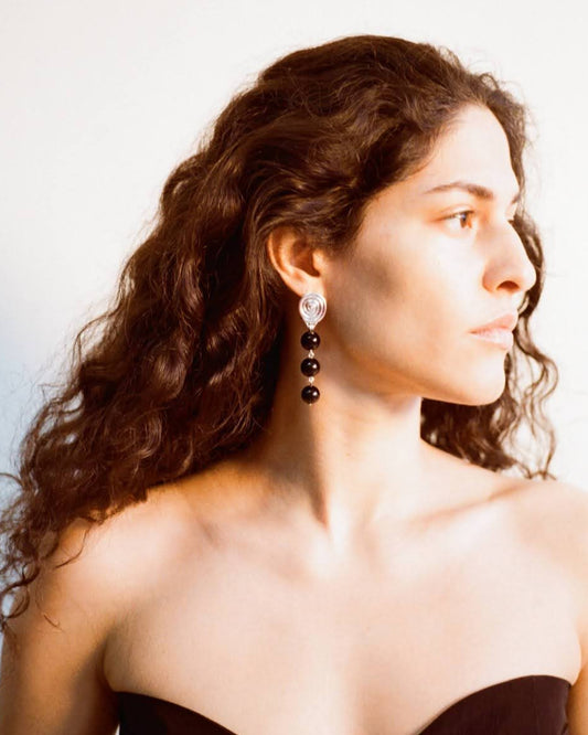 Artful and expressive, these earrings feature a sculptural swirl base with three cascading onyx drops.