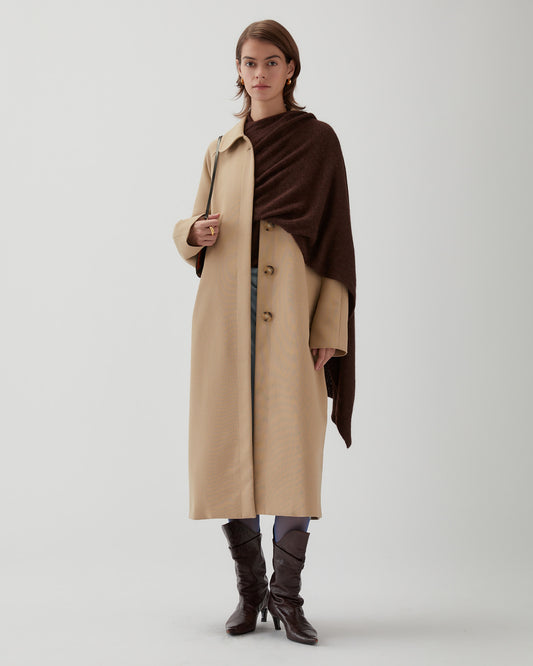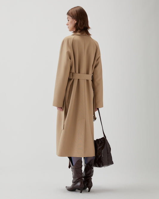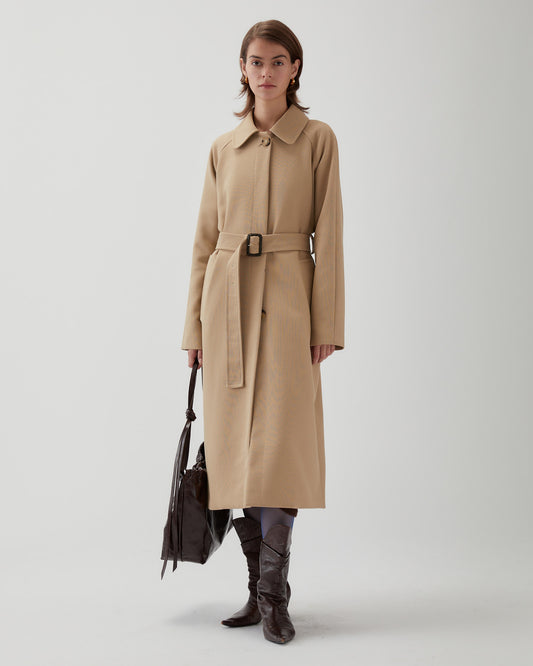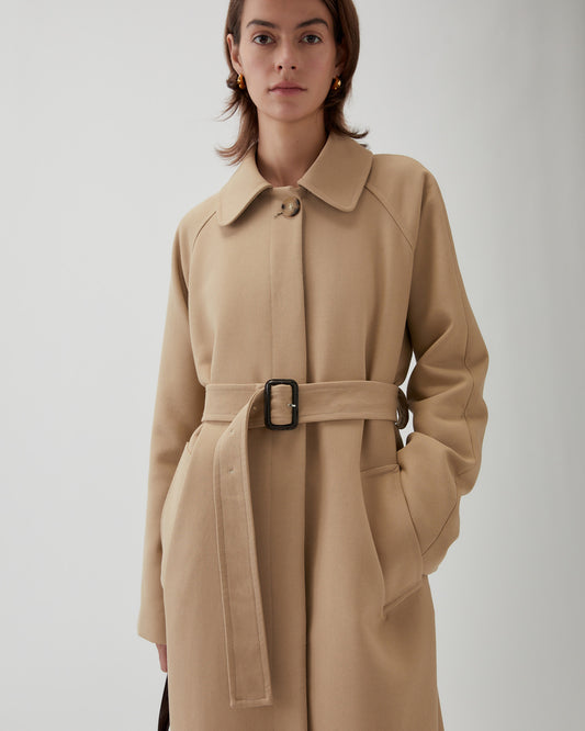 The Alice Coat in Cotton Silk Double-Face Beige features a longline, structured silhouette with clean details—side pockets, button-front closure, and a matching belt. Its timeless design makes it ideal for layering, adding modern, effortless style to any outfit.