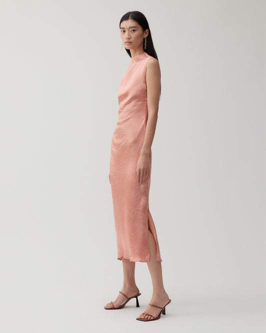 The Rejina Pyo Delilah Dress in Acetate Satin Pink is a mock neck midi dress with a slightly gathered waistline for definition and fits to your natural figure.