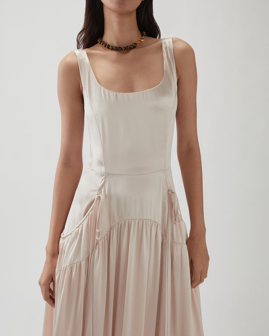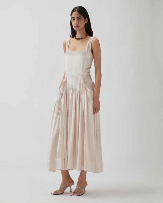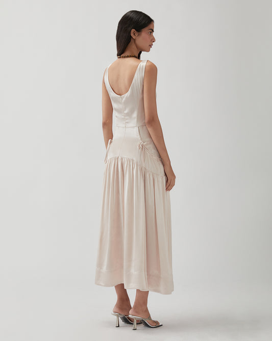 The Erica Dress is crafted from soft pink satin viscose with a subtle sheen. Designed with a fitted waist and a full skirt, it features gentle ruffles at the hips that create a sense of movement. Tie details at the pockets add a considered touch. A elegant silhouette for day or evening.