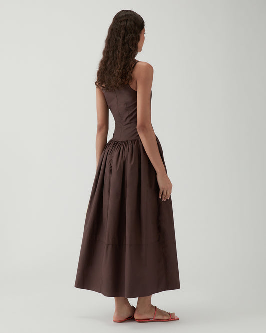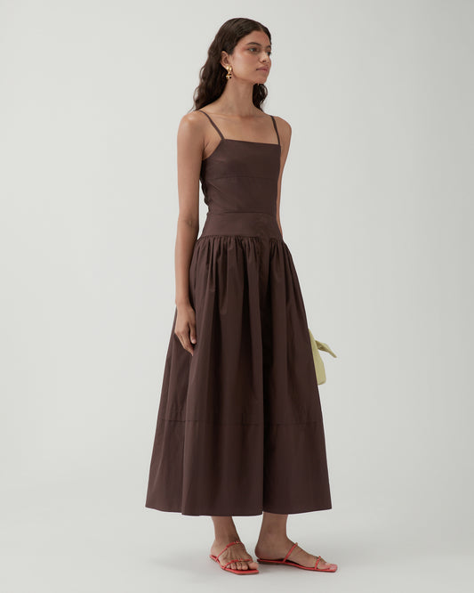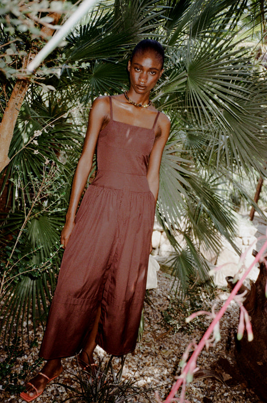 The Issy Dress features a flattering fitted waist transitioning into a full skirt, crafted from premium cotton in a rich brown hue. Designed with flattering thin straps, convenient side seam pockets, and a secure back zip closure. A fresh take on our signature Issy silhouette.