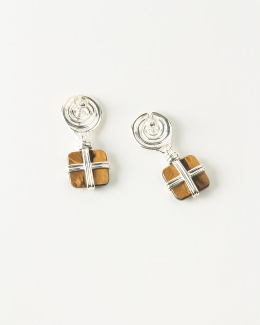 Artful earrings with a swirling base and tigers eye drop with cross detail. Silver-plated, lightweight, and ideal for dressing up any occasion, or elevating a casual look.
