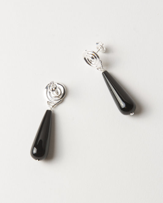The Swirl Tear Droplet earrings showcase silver-plated swirl posts combined with tapered onyx drops, creating a timeless and elegant design that is both flattering and lightweight.