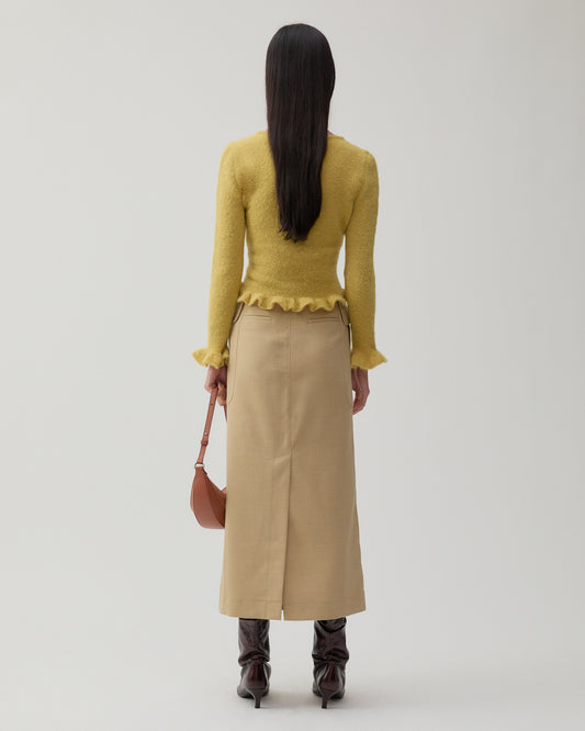 The Savie Cardigan in Alpaca Blend Yellow features pearlescent buttons down the front and delicate ruffle details at the waist and cuffs, creating a modern feminine silhouette. Crafted from ultra-soft responsibly sourced alpaca wool, it pairs elegantly with skirts or high-waisted denim, thanks to its very fitted style.