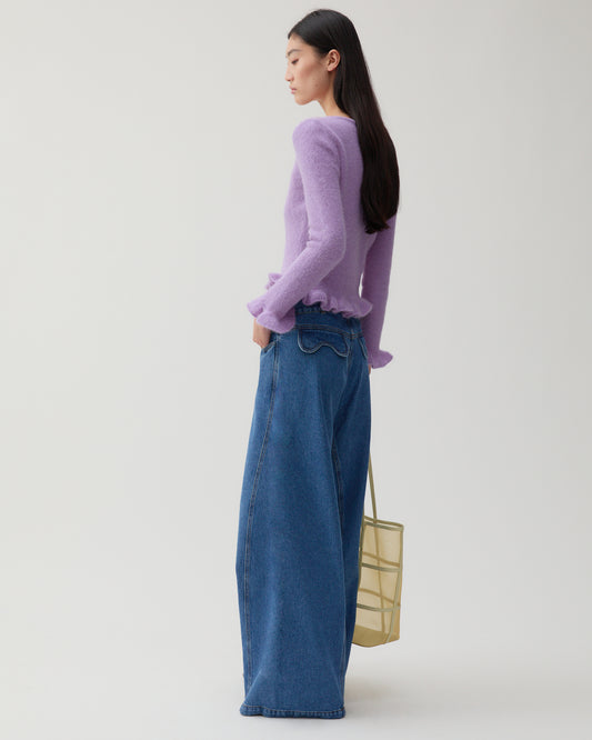 The Savie Cardigan in Alpaca Blend Lilac boasts pearlescent buttons down the front and delicate ruffle details at the waist and cuffs, creating a modern feminine silhouette. Crafted from ultra-soft responsibly sourced alpaca wool, it pairs elegantly with skirts or high-waisted denim, thanks to its very fitted style