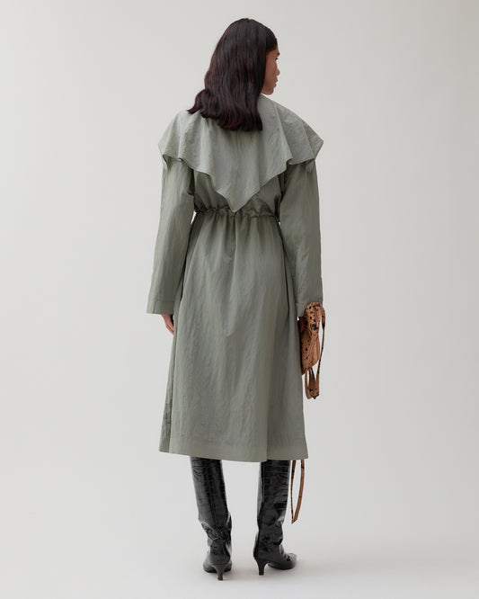 The Rejina Pyo Alana Trenchcoat in Grey taffeta is versatile and elegant with a scarf detail that can be worn in different ways. Its oversized fit, adjustable waist ties, and practical yet modern design make it a timeless wardrobe essential.
