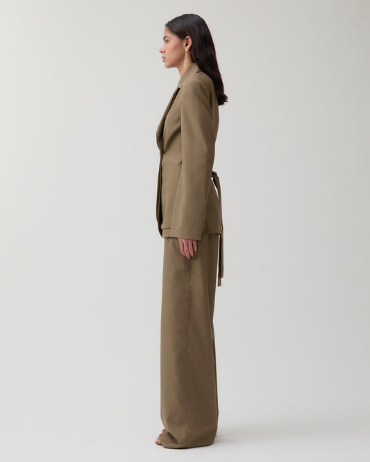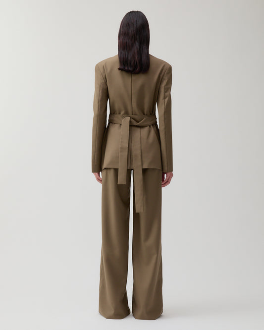 The Rejina Pyo Johanna Blazer in Wool Blend Olive is a single-breasted oversized blazer that features our signature handcrafted buttons, a curved double hem and a belt at the waist.