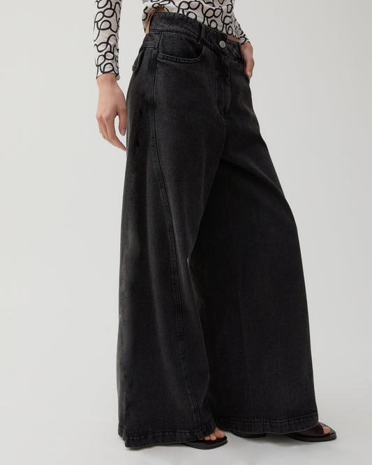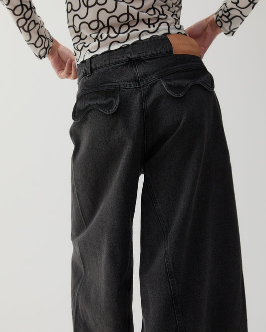 The Linda Trousers in Organic Cotton Denim Black offer a relaxed fit with twisted side seams. Made from soft organic cotton denim, these trousers provide both comfort and versatility, perfect for any casual look.