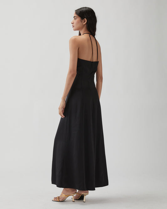 The Ellison Dress features a halter neckline with sculptural ring fitted silhouette. Crafted from duchesse satin, it offers an elegant, timeless look, perfect for formal occasions.