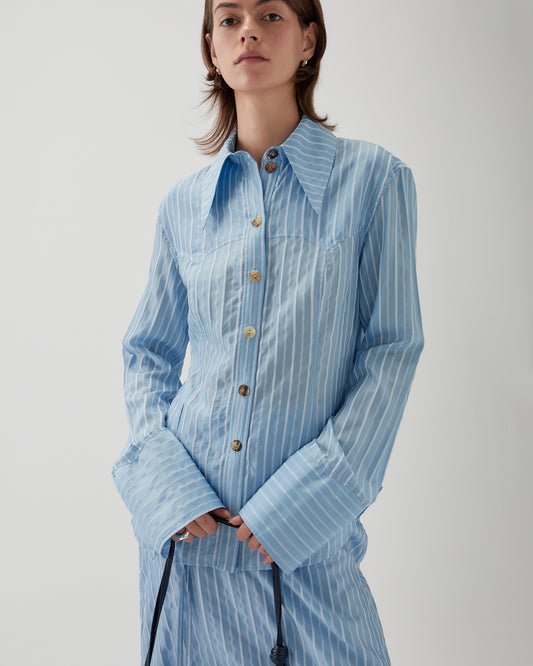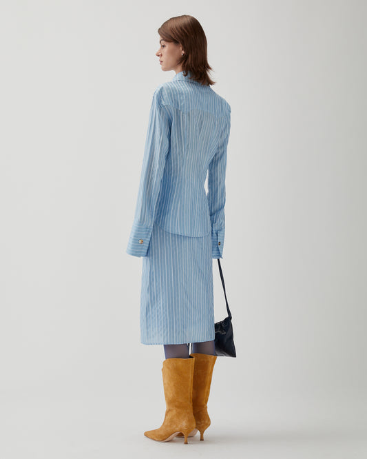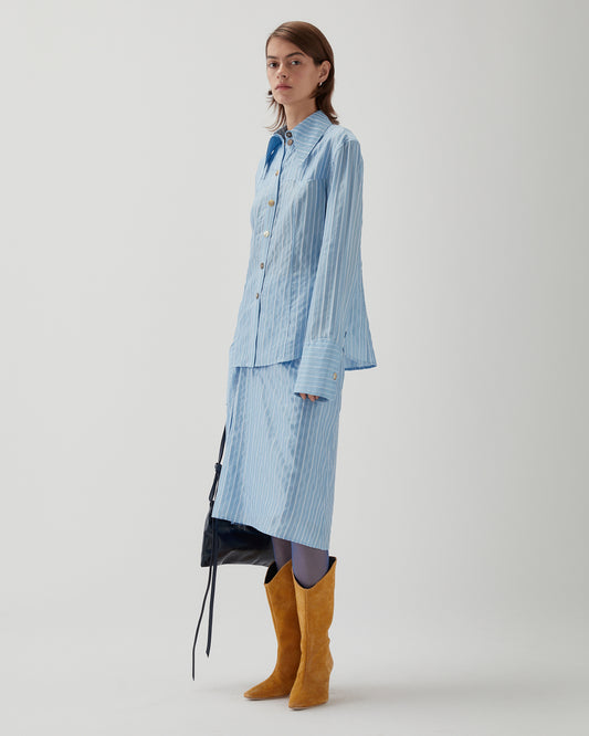 Tailored from a soft viscose blend with subtle blue stripes, the Camilla Shirt features a classic collar, clean front fastening, and a refined silhouette. Effortlessly polished, it pairs seamlessly with tailored or casual separates.