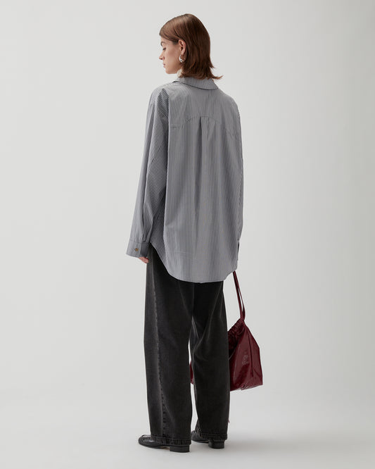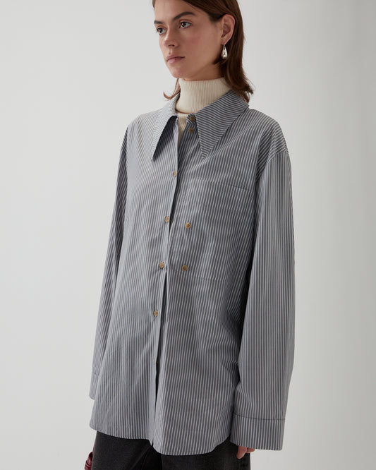 A timeless shirt crafted from soft cotton with subtle grey stripes. Designed in one size fits all, it features a relaxed silhouette, button-down front, and classic collar. A two-button detail at the bust allows for a cinched fit or a more open, effortless shape, making it versatile for layering or wearing on its own.