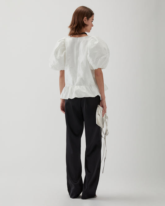 The Rejina Pyo Alara Blouse in Taffeta Cream embodies an exquisite fit-and-flare silhouette, adorned with exaggerated ballooned sleeves and an intricately designed ruffled waist detail. Finished with a zip closure at the back.