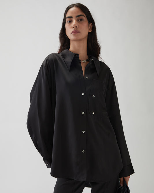 The Ellis Shirt in Duchesse Satin Black features a relaxed fit with a soft sheen and elegant button details. Crafted from a duchesse satin, it offers a comfortable and versatile unisex option. Style it with the Cathy Trousers for a coordinated, sophisticated outfit.