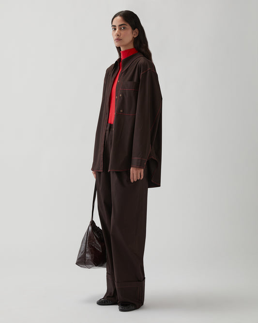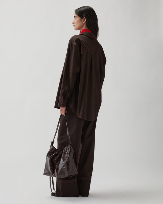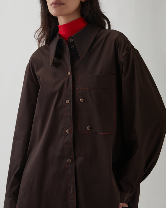 Crafted from soft sateen cotton in deep chocolate, the Ellis Shirt features contrast stitching and an oversized, relaxed silhouette. A two-button detail at the bust allows for a cinched fit or a more open, effortless shape. Designed to fit oversized, it offers a versatile layer for dressing up or down.