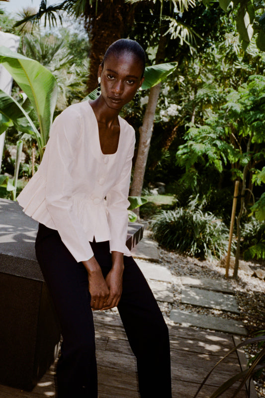 The Lana Blouse in Silk Blend Taffeta Apricot features a fit and flare silhouette, square neckline with a delicate peplum hem and button details. Crafted from a luxurious silk blend, it pairs beautifully with the Linda Trousers for an effortlessly chic and modern look.