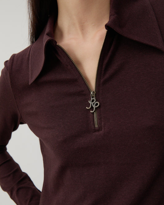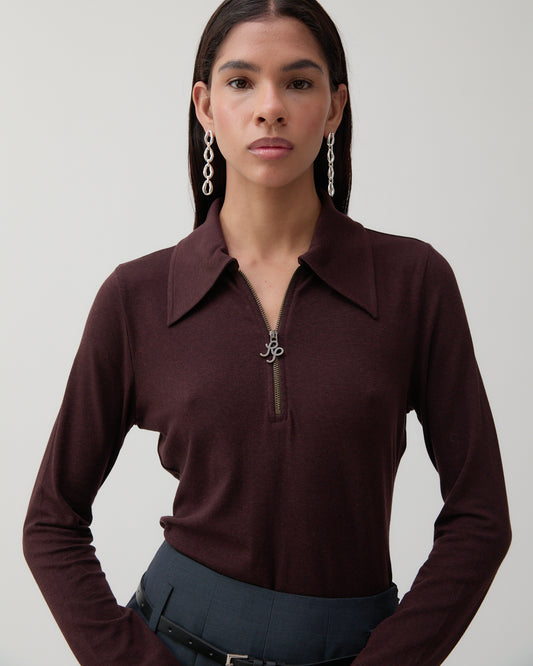 The Rejina Pyo Jasmine Top in Tencel Cotton Blend Jersey Brown features a front zip fastening with a custom monogram zip puller that is adjustable to have an open neckline or polo style.