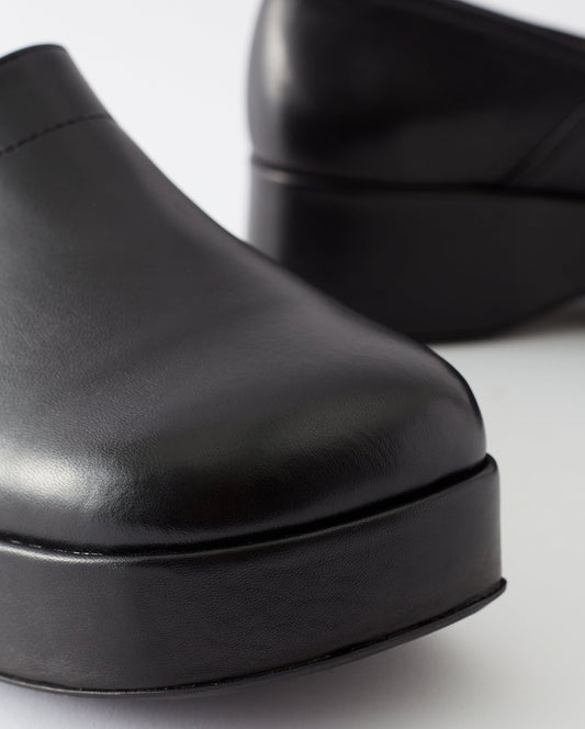 The Rejina Pyo Lucie Clogs in Nappa Leather Black are a versatile mid-height platform shoe with a rounded square toe and padded insole, made of leather sourced from Portugal.