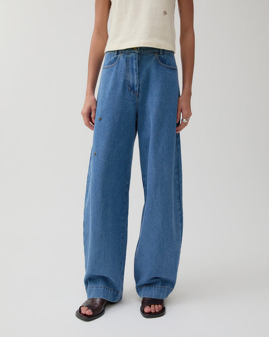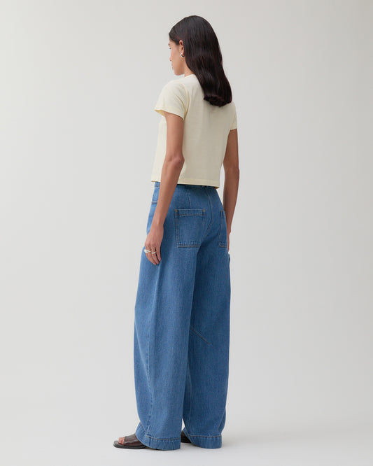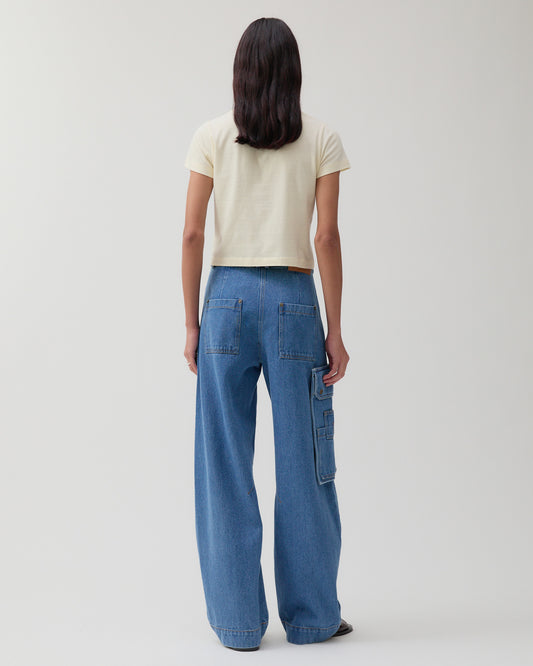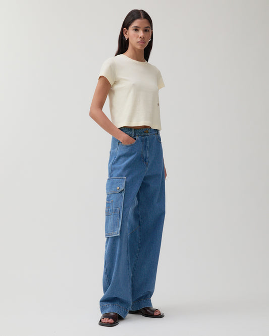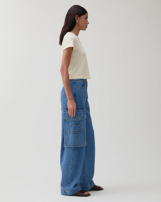 The Rejina Pyo Margot Trousers in Organic Cotton Denim Indigo are a wide leg cargo style pants that feature contrast stitching and large side pocket detailing. Made using certified organic cotton, grown with farming practices that support healthy soil and ecosystems.
