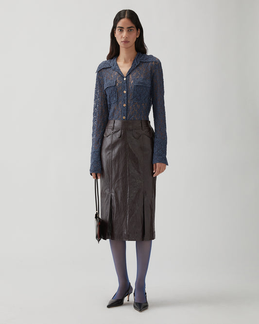 The Monroe Skirt in Faux Leather Burgundy offers a sleek, modern silhouette with a smooth, faux leather finish. Its mid length and pleats at the hem make it a standout piece that adds edge to any look.