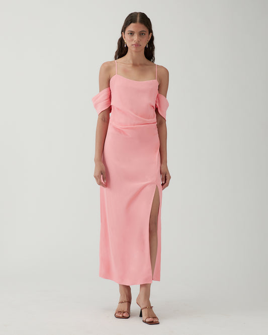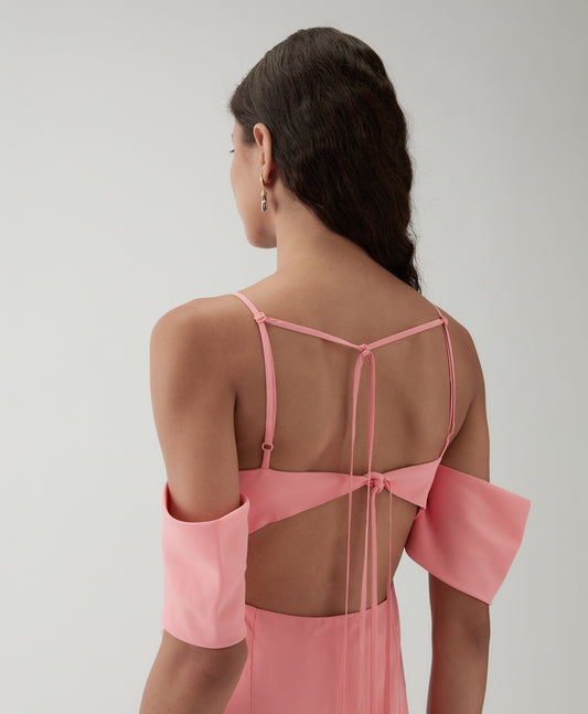 The Pauline Dress in Crepe Viscose Pink is perfect for special occasions or parties, showcasing Rejina Pyo's signature silhouette. It features thin adjustable straps and draped sleeves at the shoulders, creating an elegant look. Fitted on the body with subtle draping, it includes a slit at the leg and tie detail at the back for added flair.