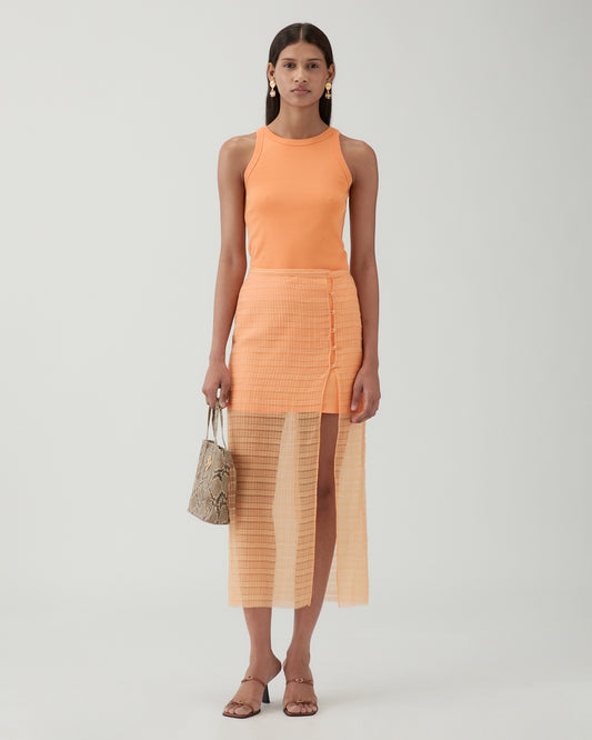 The Rejina Pyo Reya Skirt in Silk Blend Peach is a mini skirt with a sheer mid-length overlay featuring a deep side split.