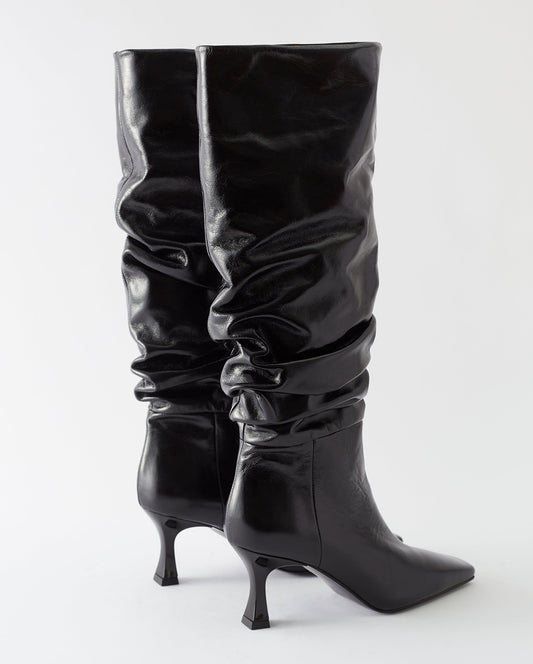 Slouchy Knee High Boot Leather Crinkle Shiny Black