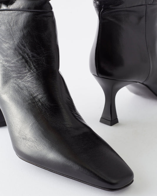 The Rejina Pyo Slouchy Knee High Boot is shown here in the intentionally worn-in Leather Crinkle Shiny Black. Features ruched detailing up the leg, pointed toe and skinny stiletto high heel.