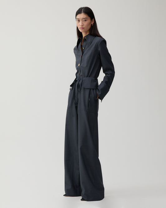 The Rejina Pyo Sonia Trousers in Wool Blend Suiting Slate features a cargo style wide-leg cut with large front pockets and a drawstring ribbon waistline.